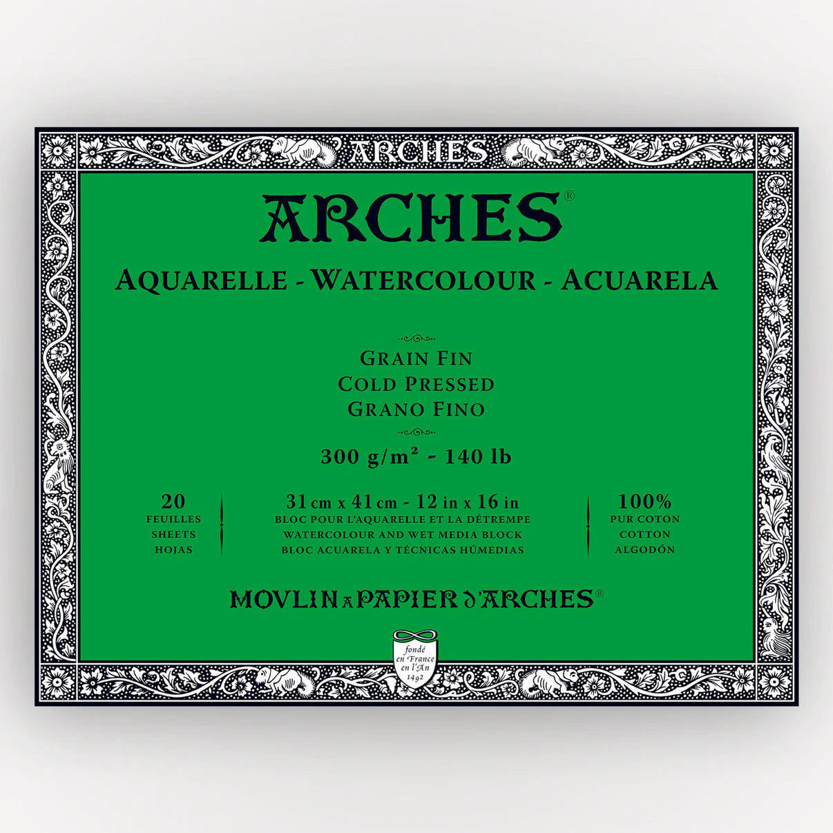 Arches is onze beste kwaliteit geschept Aquarelpapier. Het papier is 100% katoen en door de traditionele perswijze neemt het papier het beste water op. Het is bovendien zuurvrij en erg stevig. Het papier kan enorm veel water aan zonder dat de kleuren uitlopen en bobbelt niet. De Grain Fin is een glad papier met een beetje structuur, perfect voor wassingen en details.