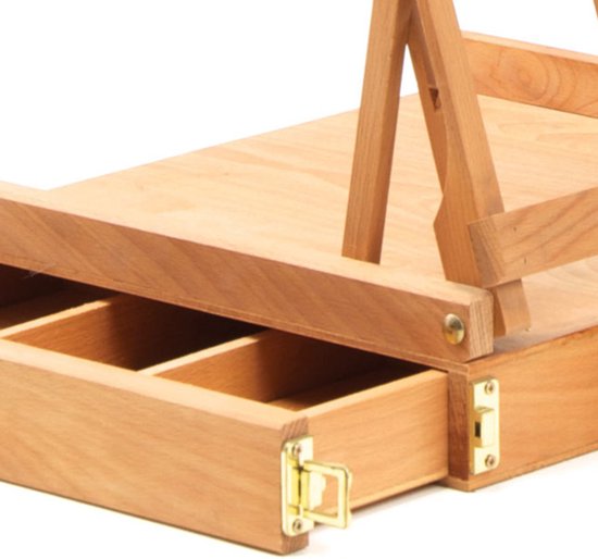 Verstellen: Eenvoudig. Met de vleugelmoertjes aan de zijkant kun je eenvoudig de hoek van de ezel bepalen. De doek klem aan de achterkant werkt ook met een vleugelmoertje, hiermee kun je je doek of tekenplank stevig vastzetten zodat je werk niet kan verschuiven tijdens het schilderen.