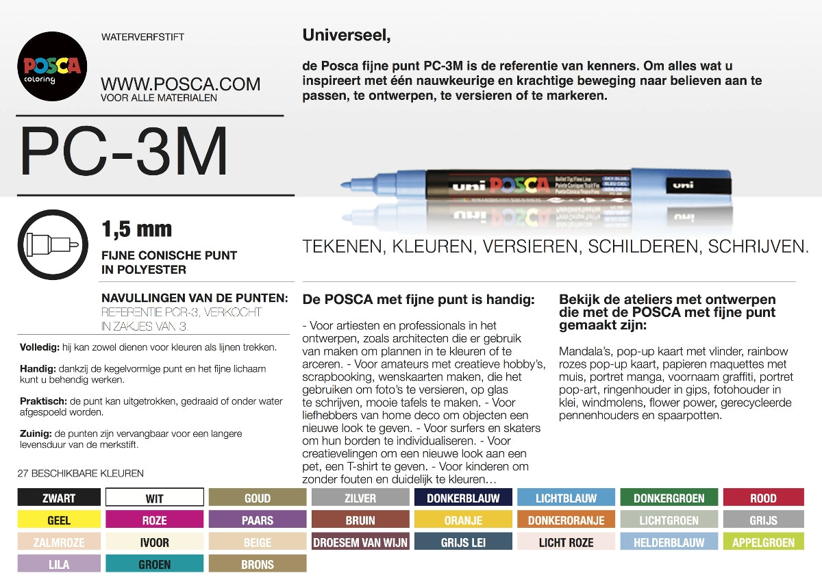 Tips voor het gebruik van de Uni-Posca Markers. Schud goed met uw Uni-Posca Acryl Marker terwijl de dop erop staat om het kogeltje te laten circuleren. Druk daarna meermaals met de punt op een vel papier, zodat dit met verf doordrenkt raakt. De kogel heeft als functie de bestanddelen tijdens het gebruik te mengen, wat aan het werk een homogene textuur geeft. Uni Posca acrylmarkers zijn dekkend, en drogen snel en watervast op. De kleuren kunnen worden gemengd als de verf nog nat is, en moeiteloos worden overgeverfd als die eenmaal droog is. Alle Posca-punten kunnen afgewassen worden en een aantal is omkeerbaar of vervangbaar. De Uni Posca Acrylmarkers zijn geschikt voor veel verschillende ondergronden en zijn getest op ander andere:
