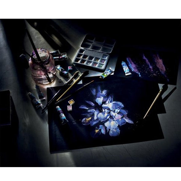 Naast het bekende blok met ansichtkaarten op wit papier, verkopen we nu ook een blok met ansichtkaarten op dit zwarte aquarelpapier (25 vellen) van Van Gogh in postkaart-formaat! Je kunt dit papier goed gebruiken voor dekkende aquarel kleuren maar ook voor metallic en interference kleuren.