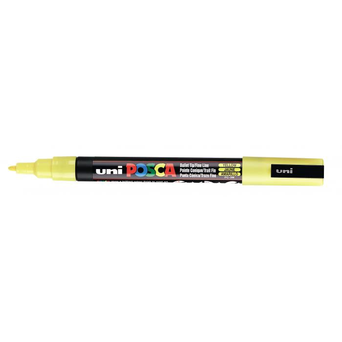 De Posca verf stift PC3M is een verfstift met een fijne punt, alleen niet zo heel fijn als de PC-1MR 0.7 mm (fineliner) en de PC1MC met conische punt. De punt van de UNI posca PC3M acryl marker is een beetje rond. Deze verf marker is geschikt voor lijnen, maar iets minder geschikt voor vlakken, dan zouden de grotere posca’s (Posca PC-5M, Posca PC-8K, Posca PC-7K of Posca PC-17K) meer geschikt zijn. Nadat je goed geschud hebt, kan je de stift met de punt enkele keren indrukken zodat de punt zich vult met verf. Over het algemeen blijft de verfstift dan ook tijdens gebruik zeer goed doorlopen. Zelfs als deze enkele dagen of soms weken ongebruikt in een la ligt. Het beste kan je paint markers liggend bewaren.