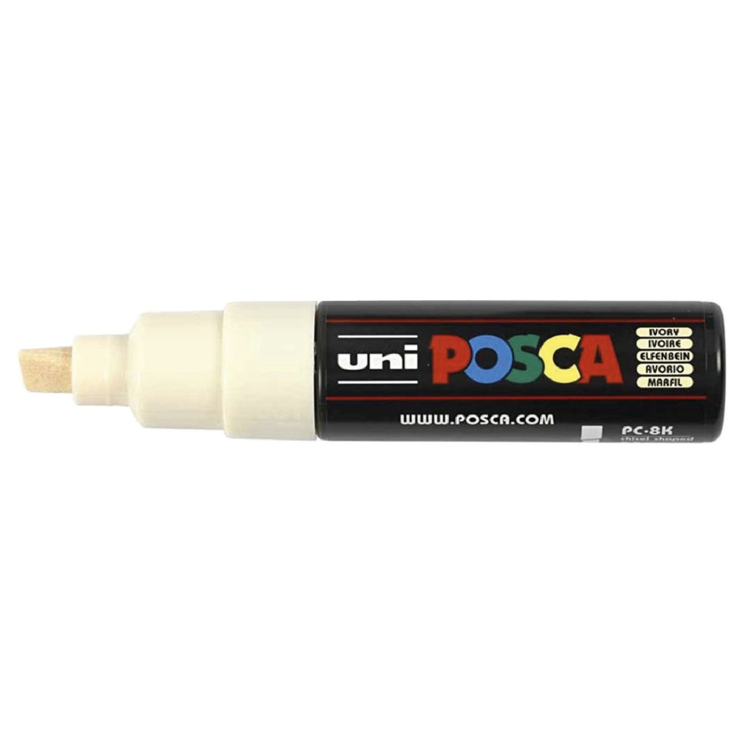 De Posca acryl PC-8K 8 mm breed is een verfstift met een wat grotere beitelpunt, even dik als de PC-8M, maar deze acryl markerpunt is dus rechthoekig. Deze verf marker is geschikt voor lijnen ook voor vlakken. Nadat je goed geschud hebt, kan je de stift met de punt enkele keren indrukken zodat de punt zich vult met verf. Over het algemeen blijft de verfstift dan ook tijdens gebruik zeer goed doorlopen. Zelfs als deze enkele dagen of soms weken ongebruikt in een la ligt. Het beste kan je paint markers liggend bewaren.