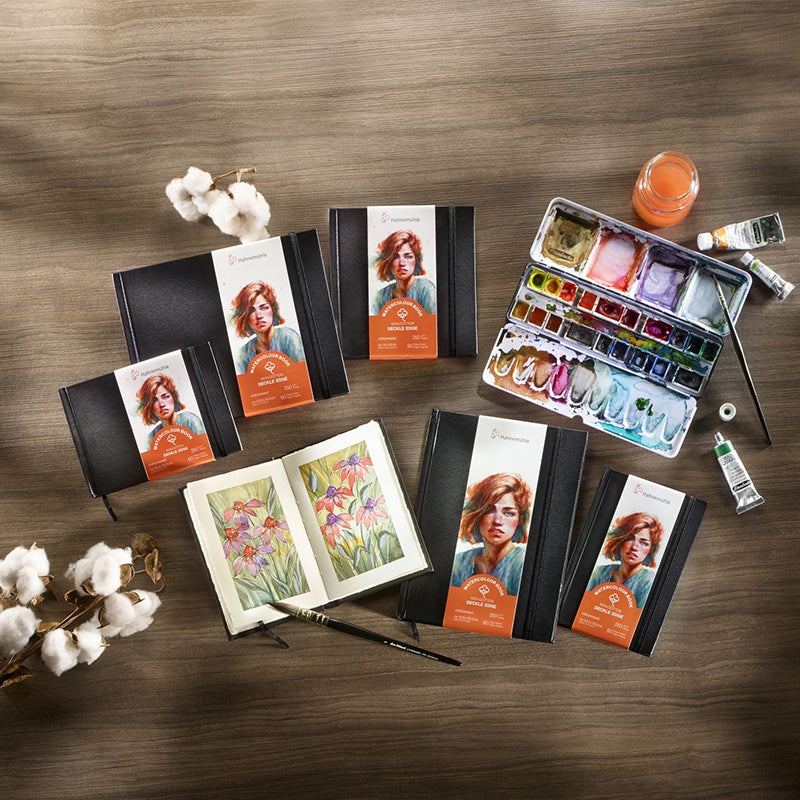 Dummy schetsboek Landschap (15,3 x 10,3 cm) 60 vel, 250 grams, cold pressed, 100% katoen. Hahnemuhle gebonden Dummies zijn van goede kwaliteit met een harde zwarte kaft, leer-look. Het papier in deze dummie heeft een driezijdige, handgescheurde rand, wat een natuurlijke uitstraling geeft. De natuurlijke textuur van het papier biedt een mooi oppervlak voor zowel subtiele, gedetaileerde als grovere, brede penseelstreken.