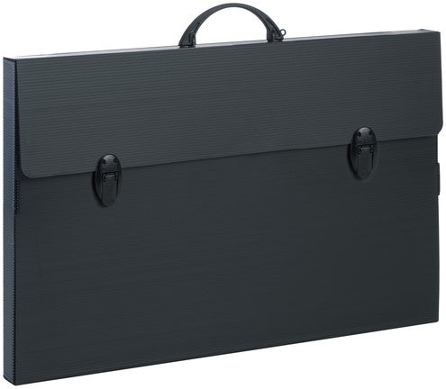 Handig voor het vervoeren of bewaren van tekeningen. Door het handvat kun je deze tekenkoffer ook makkelijk meenemen. Er kunnen behoorlijk veel tekening in opgeborgen worden in deze tekenmap en ook foambord. De map sluit met 2 klepjes die je handig omhoog kunt klikken. Stevige sluitingen. Binnen in de map zit een groot vak waar je al je tekeningen of ander werk in kwijt kunt. Door de 2 verstevigingen aan de zijkant van de map zit je werk mooi beschermd. In deze map kun je werk kwijt tot en met 50x70 cm, er past dus sowiso een A2 papier in. Deze map kan ook prima tegen een regen buitje, want het is spatwaterdicht.