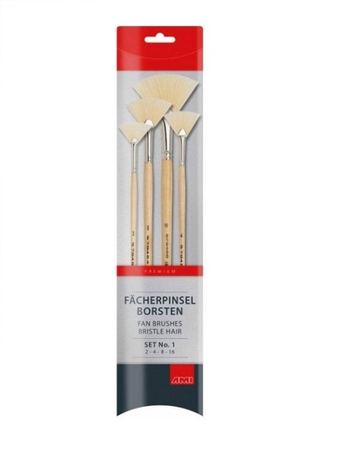 Penselenset bestaande uit 4 platte penselen van varkenshaar in waaiervorm, in de maten 2, 4, 8 en 16. Speciaal geschikt voor olieverf en acrylverf. Premium serie.